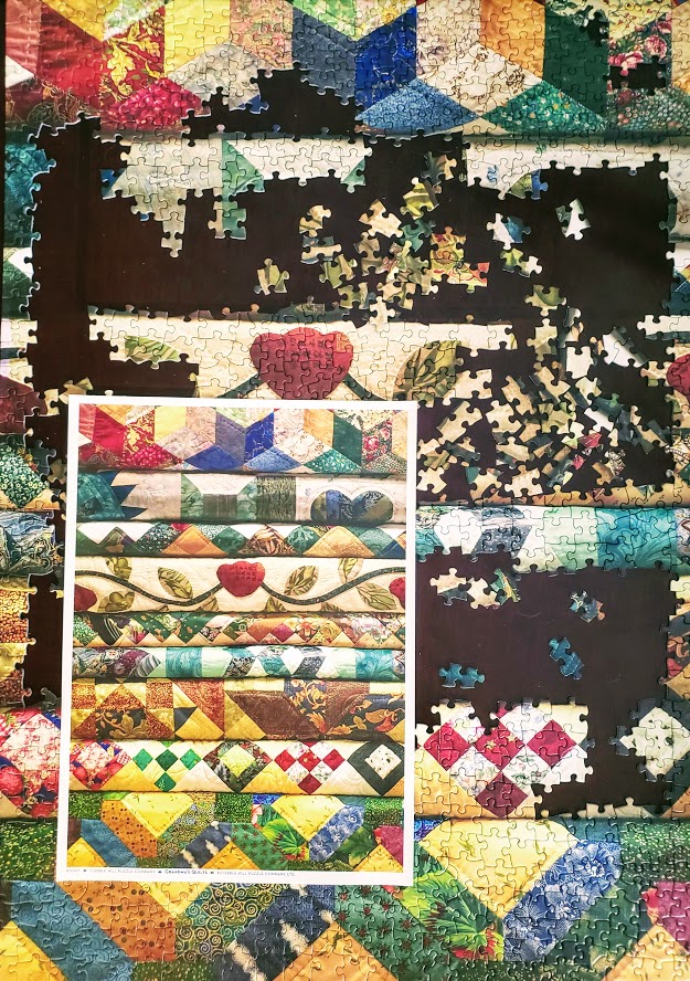 A couple of my latest puzzles — the one on the left was devilish AND I managed to lose one piece. I’m working on the quilt one right now — it’s delightful. My dreams will be full of color. . .