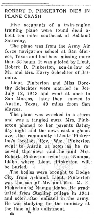 Within a year after Pearl Harbor, Bob Pinkerton, along with his two brothers and three of Dorothy’s brothers as well, enlisted. Bob was in the Army Air Corps, getting flight training in Texas, but during a leave in the summer of 1942 he went to the Sterling commencement, where he and Dorothy spent ten days getting re-acquainted at the end of which they “knew [they] were serious.” Before she started her second year of teaching in Nickerson, KS, Dorothy rode a bus to Uvalde, Texas, where Bob was stationed, for a short visit. She visited again at Christmas, by which time Bob was in advanced training. They wrote each other often and a few of those letters survive. As early as August of ’42, Bob and Dorothy were tossing around the question of whether marriage made sense during a war. At the end of the school year in May 1943, Dorothy went to Texas again, where Bob formally proposed. They agreed on a tentative wedding date of July 12 and after a 10-day visit, she returned to Jetmore to convince her parents that a wartime marriage was a good idea. “They objected until they received a letter from Bob.” (It’s a good letter.)