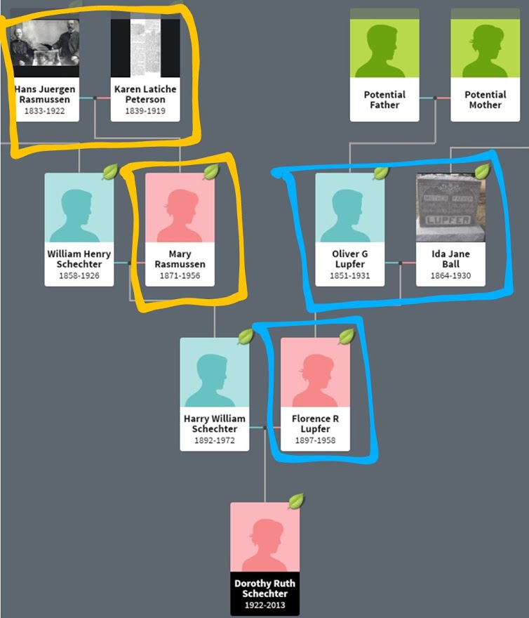 I just joined Ancestry.com, so have only a rudimentary understanding of all the available features, but here are two family trees I constructed, one starting with Jim Rasmussen, one with my mother, Dorothy Schechter. I just learned how to draw on photos in a crude, childlike way, and have marked the ancestors that Jim and Dorothy have in common. The first cousin connection is that each had a Lupfer mother from the same set of siblings (blue). Florence Lupfer Schechter was Dorothy’s mom and Eula Lupfer Rasmussen was Jim’s. The second cousin connection is that each had a Rasmussen grandparent from the same set of siblings (yellow): Mary Rasmussen Schechter was Dorothy’s grandmother and her brother, Nels Peter Rasmussen was Jim’s grandfather. Whew. It doesn’t really matter if YOU get it, but I think this little exercise made it clearer to me.