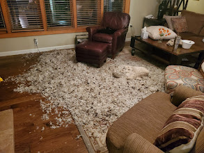 The havoc Mac wreaked on a really nice pillow. It took us a couple of hours to clean up, but the owners have forgiven him.