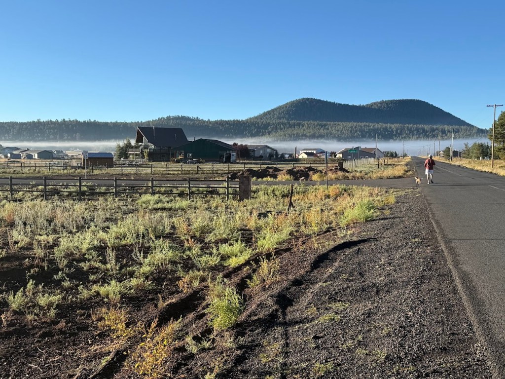 This summer started with a cruise to Norway, Scotland and England. (I started a post about that trip, but didn’t finish it. If you’re interested in hearing about it, let me know and I’ll forward you a brief email with a few photos that I sent my siblings when we got home.) Shortly after getting back from that trip, we flew to Portland OR for a few days with our daughter Katie. So our time in Flagstaff really began in late July. I was suddenly inspired to try walking on Bader Road again, this time in the dawn cool. Richard decided to join, bringing Mac along. It has become a daily ritual.