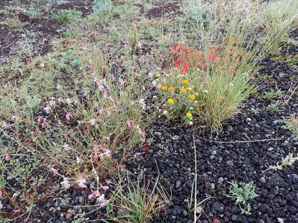 Side-by side: Lindheimer’s bee blossom, curlycup gumweed, and scarlet gilia: