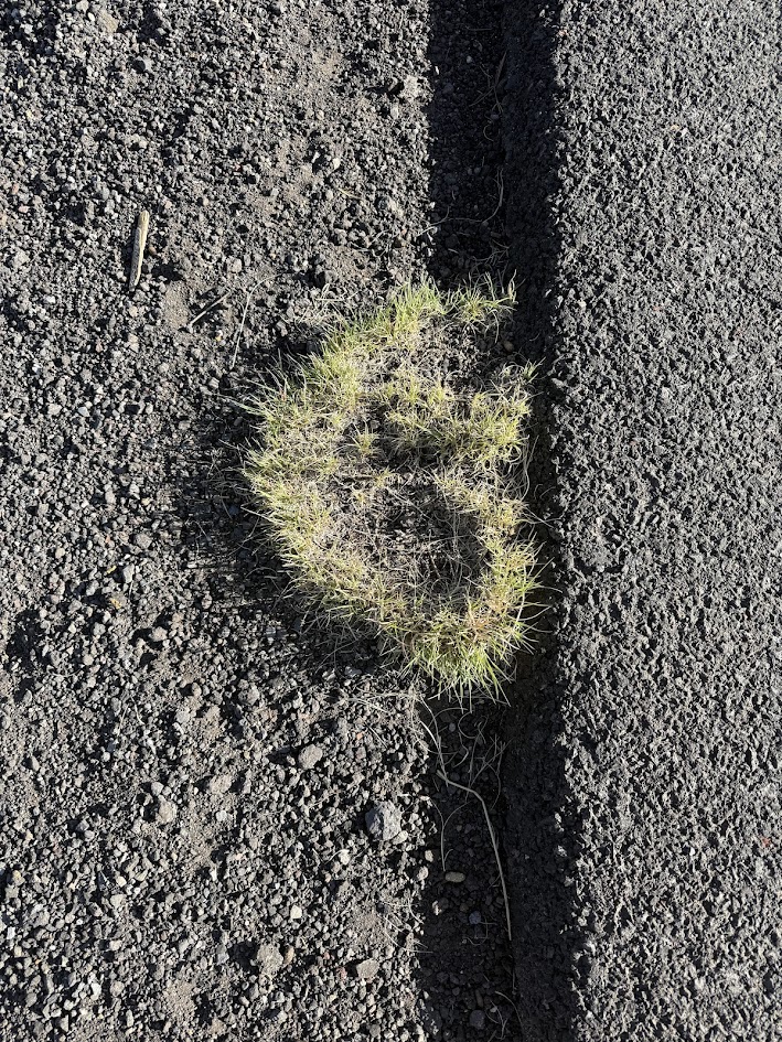 One last bit of flora. As miraculously happens everywhere, on Bader Rd, grass grows from asphalt and concrete cracks. I spotted this particular clump and it reminded me of a time when Sam was small — maybe three years old — and we were walking in a parking lot. He was talking a blue streak, but interrupted his ramble to point to a handicapped parking symbol, saying, “It’s trying to be a G.” This heroic clump is doing the same.