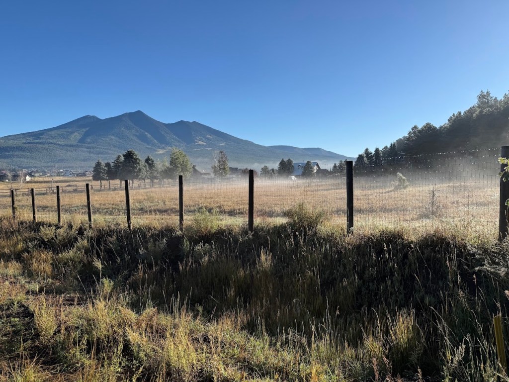 To come home, we go back north, with the San Francisco Peaks on the horizon. I am not clear on which peaks are which. The Museum of Northern AZ, which is on the road back to Flagstaff and well worth visiting, has a relief map that shows that they are a chain of peaks that include Agassiz, Humphreys, Fremont and three smaller ones. I took this photo walking back home on a dewy morning recently, when everything was sparkling. Dewdrops in the morning light are the only diamonds that appeal to me.